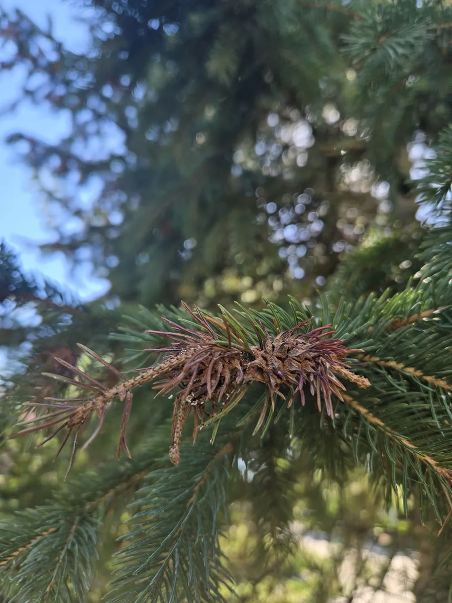 The distinctive, cone-like growths known as Spruce Galls are a common misnomer, as they are caused not by mites, but by adelgids (tiny, aphid-like insects) whose feeding induces the tree to form protective galls; the two main types are the pineapple-shaped Eastern Gall (at the base of new shoots) and the cone-shaped Cooley Gall (at the tip of new shoots). Since the insects are protected inside the gall once it forms, effective chemical treatment requires precise timing—either in the early spring just before bud break (using products like horticultural oil) or in the fall to kill the overwintering generation. While light infestations on small trees can be managed by pruning and destroying the galls while they are still green and closed, the best action for comprehensive and properly timed application is to contact a professional immediately, as the correct window for treatment is very narrow. To ensure your spruces receive the correct diagnosis and optimally timed treatment, please call a tree health care expert like the professionals at Turf and Tree Worx.